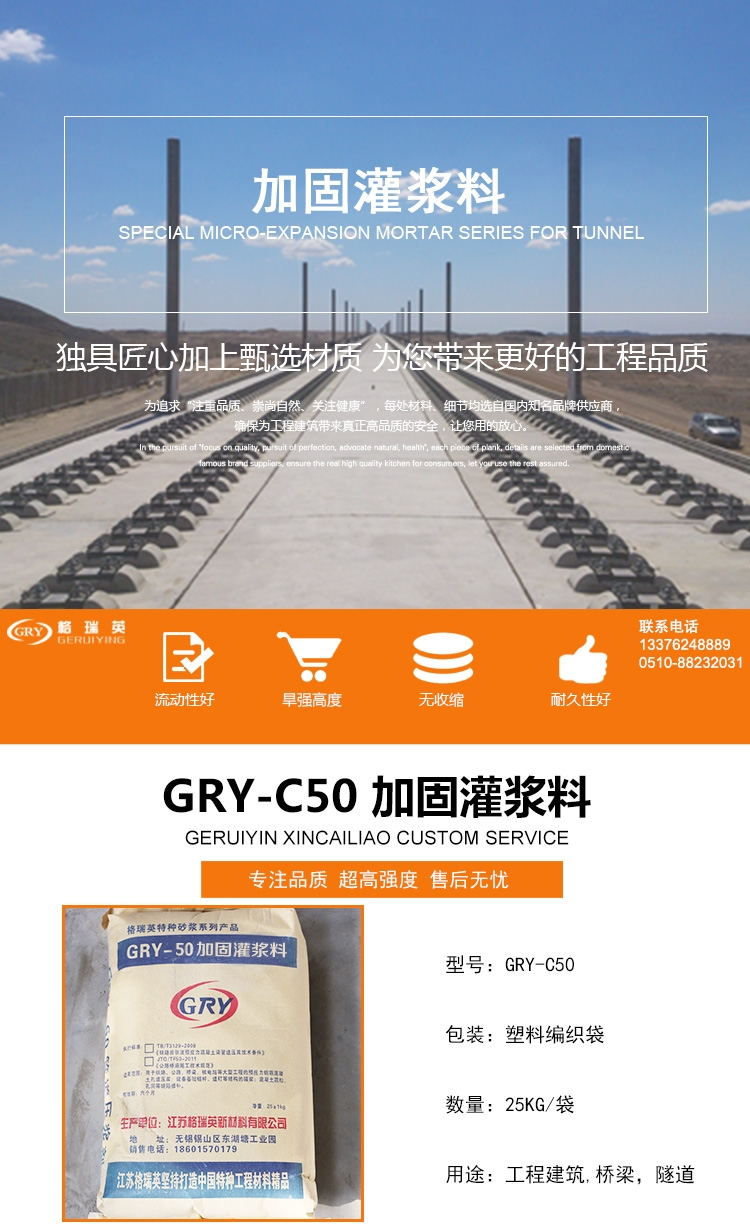 產品簡介:c50/c60/c70 加固 灌漿料 主要性能指標 項目 GRY-C40 GRY-C50 GRY-C60 GRY-C70 GRY-C80 GRY-C90 抗壓強度(MPa) 2h / / / 20 / / 1d 20 25 30 40 / 55 28d 40 65 65 65 80 65 56d 60 65 65 65 80 90 90d 不降低 不降低 不降低 不